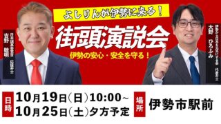 日本について思うこと 伊勢市議会選挙・大野ひろふみ氏の応援演説に「よしりん」こと吉野敏明氏が伊勢に来ます!!2回来ます! やっと情報が出ました。街頭演説で大野さんが「伊勢に日本誠真会党首の吉野敏明氏が伊勢に来るので見に来てください」と言っていましたが、場所や時間は不明でした。詳細が出ましたので共有したいと思います。直近はもう3日後です。こんなチャンスはなかなか... 2025.10.16 日本について思うこと