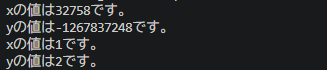 }最初宣言しただけの代入する前のx,yには何が入ってるんでしょうか?試しに宣言のすぐ下にprintf関数をいれて何が入っているか見てみました。