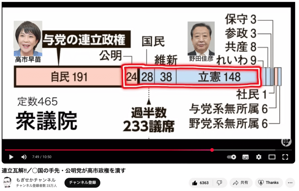 今自公は過半数割れている状態ですが公明党の24議席(衆議院)が野党になり野党連合ができると自民党より多くなってしまい高市さんは総理になれなくなります。