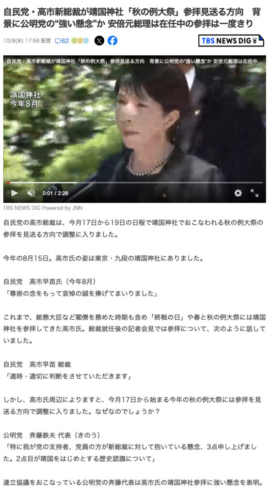 これで高市さんは折れて秋の靖国参拝を見送ることにしたようです。あくまで「秋の」ですがね。公明党と連立がなくなれば堂々といけるでしょう。